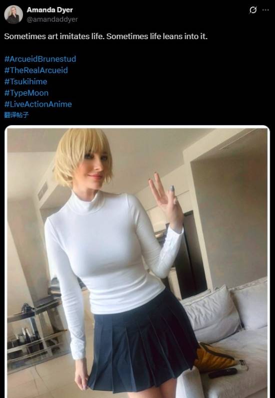戴尔在发现这段关联后,一直坦然接受自己是爱尔奎特现实原型的身份。她近日在X上发布的一则动态显示,她终于cos重制版《月姬 -A piece of blue glass moon-》中爱尔奎特的经典造型。