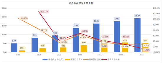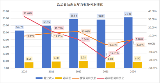 2020年,洽洽创始人陈先保提出“百亿营收、百万终端”的双百战略,计划2023年营收突破100亿元。然而,2023年营收仅68.06亿元,2024年增至71.31亿元,距目标仍差近三成。增速从2020年的9.35%一路放缓至2024年的4.79%,百亿梦碎。